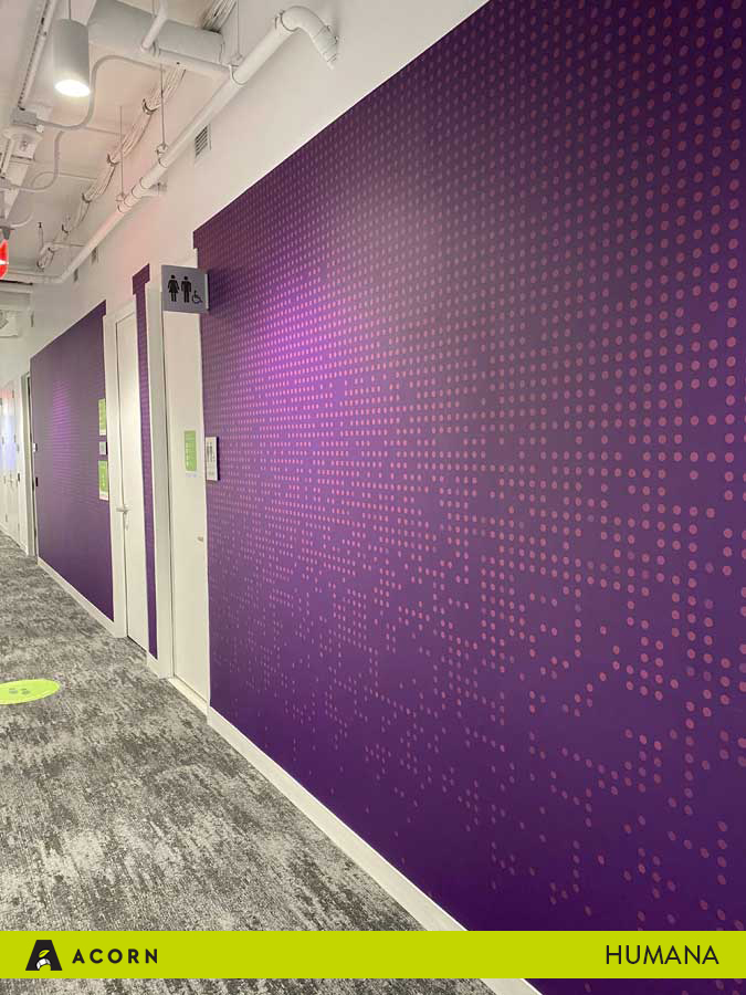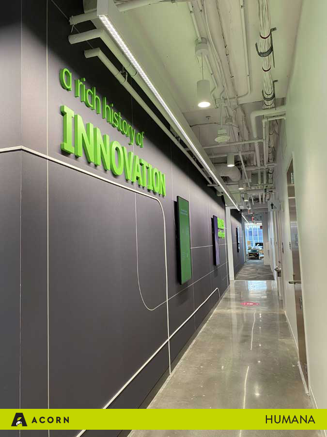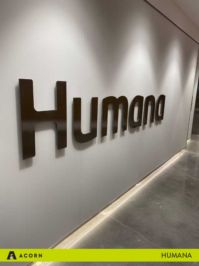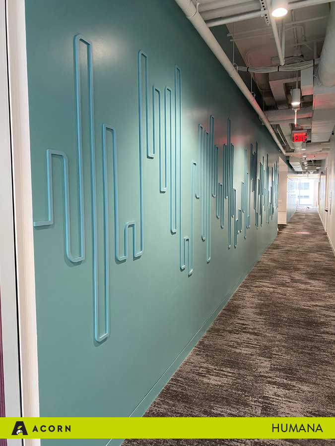 Humana opened a new office in Arlington, Virginia, and our team at Acorn partnered with them to fabricate the signage and artwork for their innovative new space. The architecture firm, Interior Architects (IA), created the high-end office for Humana, as well as designed the unique environmental graphic design elements. After they developed the designs for the space, Humana and IA passed them to Acorn, and we provided the fabrication and installation.