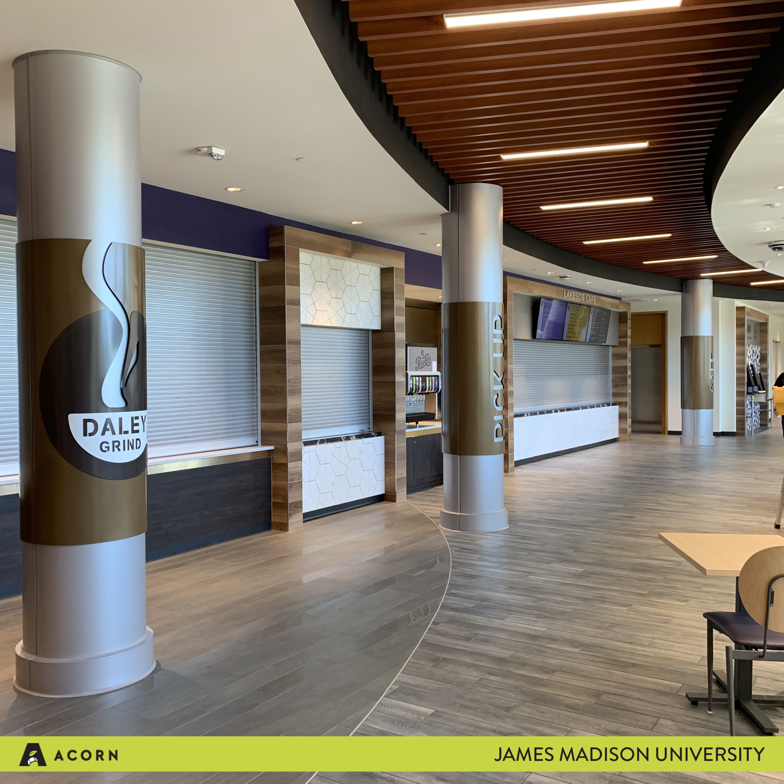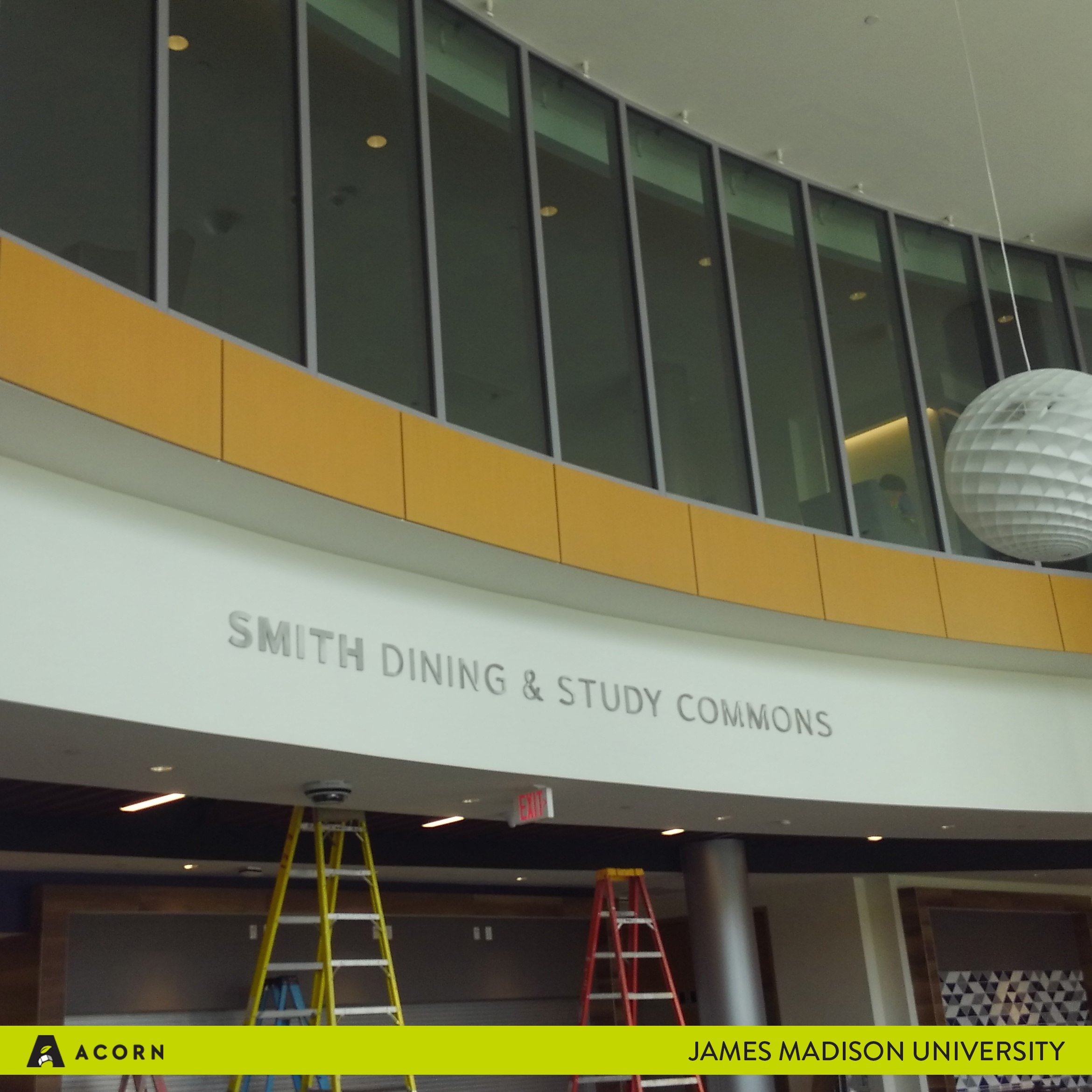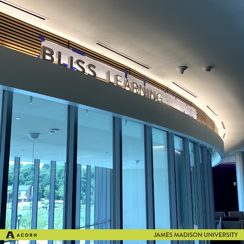 Here at Acorn Sign, we have partnered with James Madison University to fabricate a wide range of signage needs for their new Advanced Learning Complex. JMU, located in Virginia’s Shenandoah Valley, has designed this new space to facilitate innovative learning opportunities for their students. Our passion at Acorn is to develop signage that helps individuals navigate built environments while being stewards of our clients’ brands. In our work with JMU, we were able to assist in implementing their vision for this new space through signage.