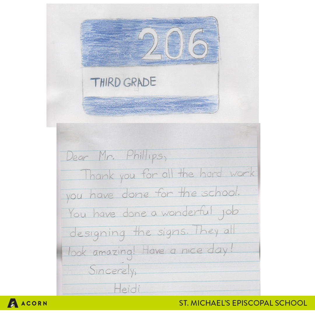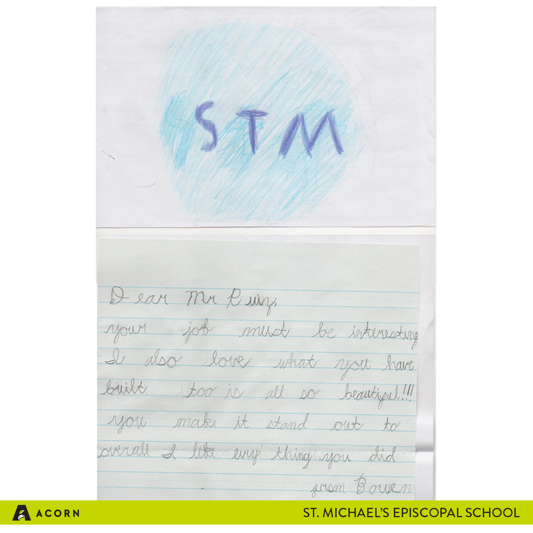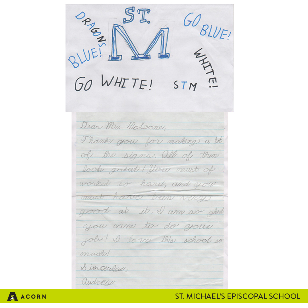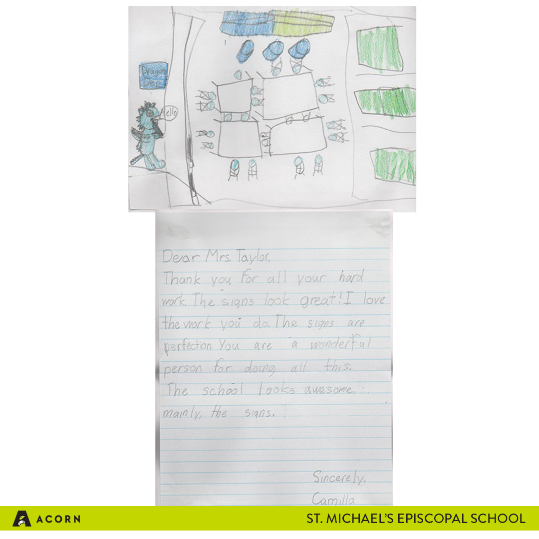 Our Acorn in Action for this week looks different than previous Acorn in Action posts because this week, we want to feature the thank you letters we received from one of our clients: St. Michael’s Episcopal School. These thank you letters were special to us because they were written by the students attending the school.