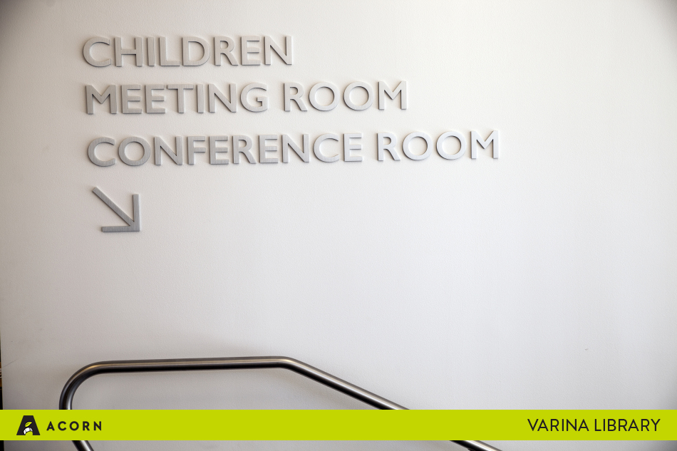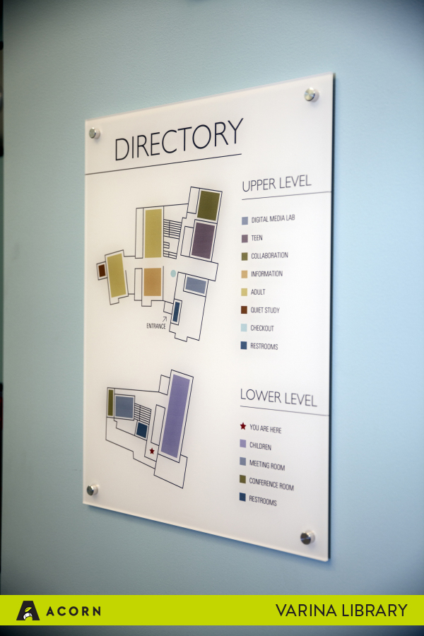 Our team at Acorn partnered with the Varina Library to produce a wide range of signage, including wayfinding signage, ADA-compliant room signs, digital monumentation, architectural signage, vinyl graphics and more. This project required us to fabricate signage using multiple media and innovate alongside the team of architects designing the building. We are passionate about environmental consciousness in our work, and we are proud that the Varina Library received LEED Certification to designate that it is a green building.
